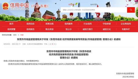 近期,东莞市市场监督管理局印发《东莞市促进经济高质量开展专项资金(市场监督管理)管理办法》,《办法》涉及质量提升、知识产权两个大类、28个资助项目,首期专项资金规模1.07亿元,最高单项奖励资金达3000万元,并将陆续在实施三年。